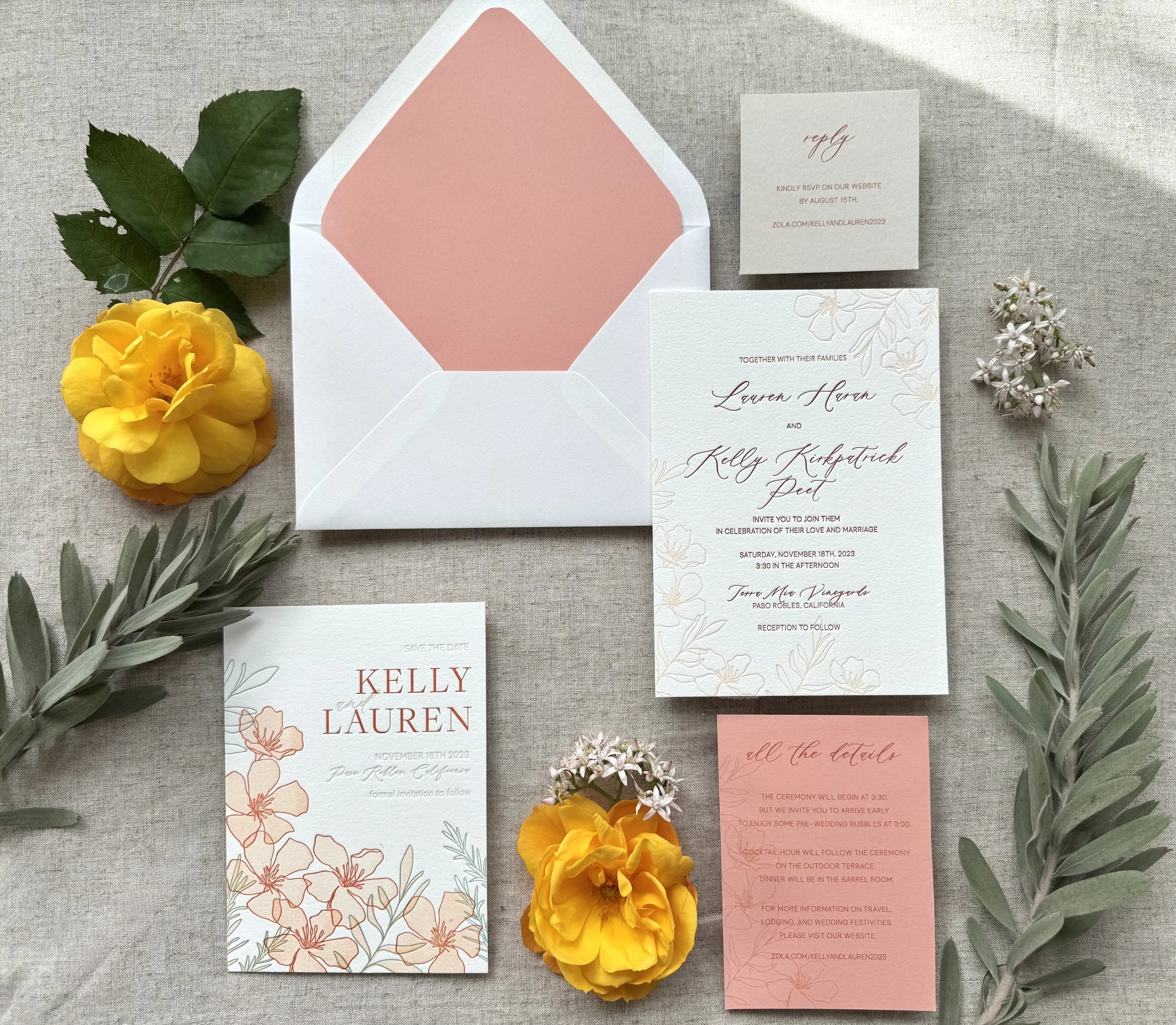 Design Details: This custom letterpress wedding invitation suite was inspired by the flowers in bloom in Italy, where Kelly and Lauren got engaged. We created hand-drawn floral illustrations and used them to design a four-color, overprinted save the date. The floral motif carries through the entire suite, which was printed on double-thick cotton paper for a luxurious, tactile finish.