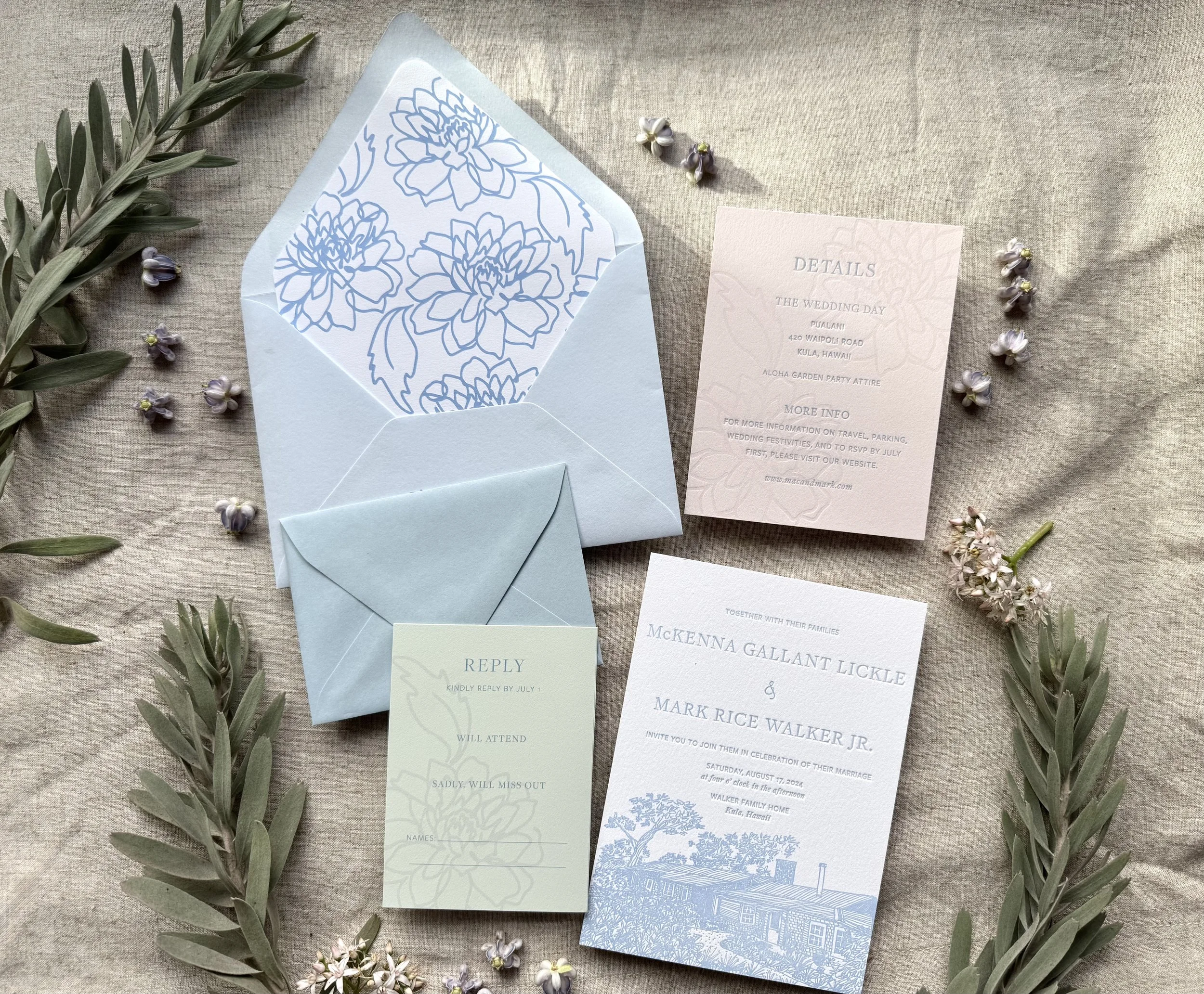 Design Details: This custom letterpress wedding invitation suite was inspired by a hand-drawn venue illustration created by the groomโ€™s mother. The bride is very eco conscious, and wanted to use as much tree-free paper as possible, so the invitation, details card, and envelope liners are all letterpress printed on cotton paper. We incorporated delicate floral and botanical line art to complement the garden party wedding theme, tying everything together with a soft pastel color palette.