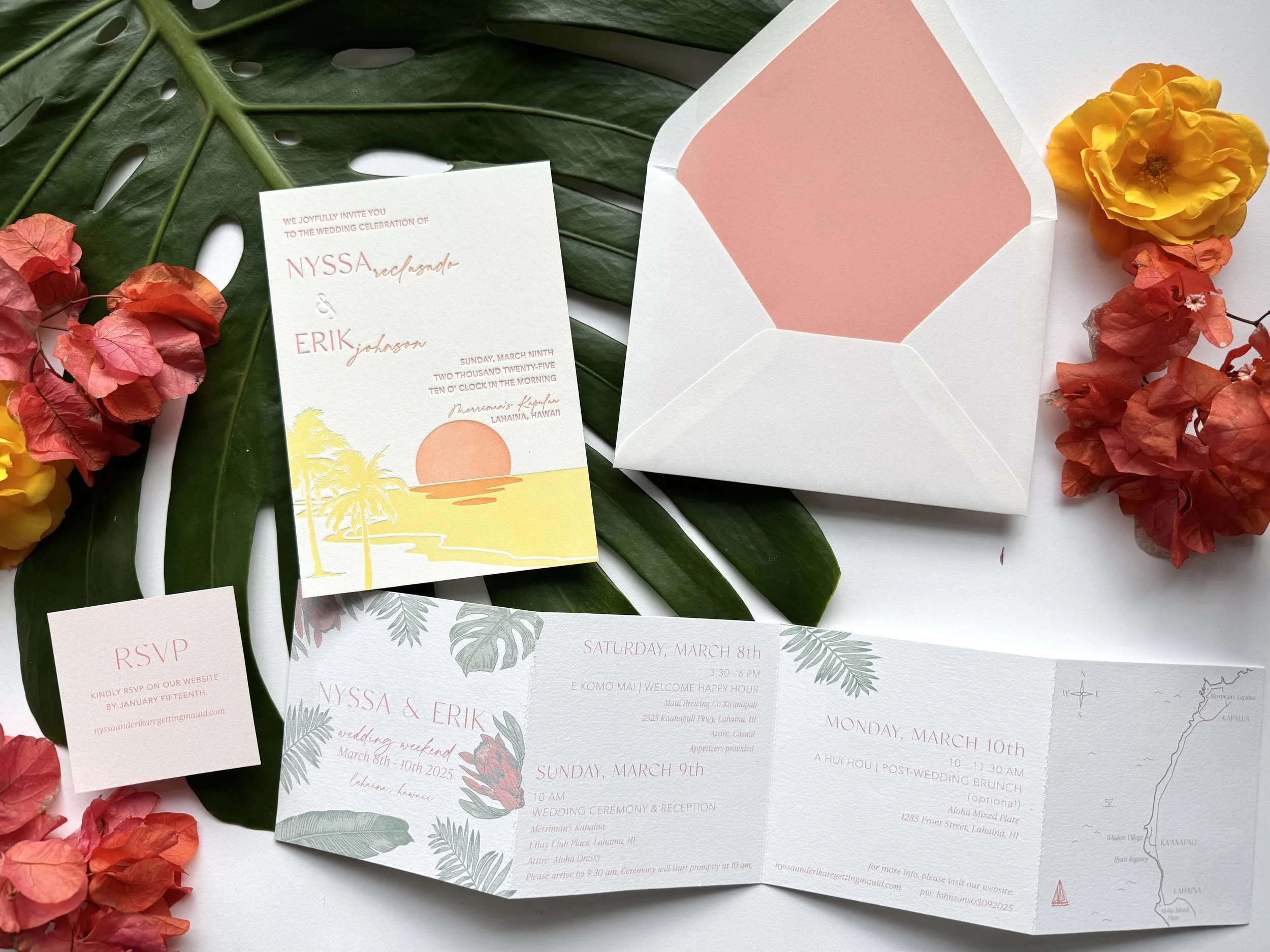 Design Details: For their destination wedding, Nyssa and Eric envisioned bright, tropical-inspired stationery filled with color and personality. We designed a three-color letterpress invitation that captures the glow of a beachside sunset, inspired by the evenings Nyssa spent watching the sun dip below the ocean near her home. The tropical wedding theme continued through a quad-fold weekend itinerary, giving each guest a vibrant and cohesive look at the celebration ahead.